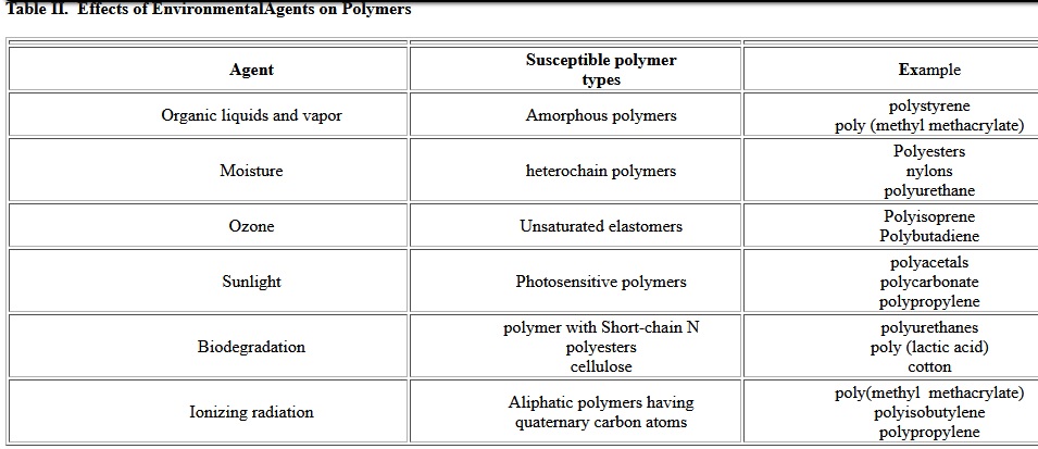 The durability of geotextiles strongly depends on material degradation. This is influenced by the inherent properties of Fibers, such as their chemical nature and properties controlled by processing variables. The practical consequences of degradation are discoloration, surface crazing (formation of surface micro-cracks), embrittlement, and loss of mechanical properties (elongation, impact strength, tensile strength). Considering applications of geosynthetics are almost always outdoors, the degradation of polymers must be taken account when select polymers. There are many environmental factors which influence aging mechanisms of geotextiles. Polymers can degrade by exposure to high temperature (thermal degradation), oxygen and ozone, ultraviolet light, moisture, radiation and chemical agents. Often multiple exposures, such as a combination of moisture and heat or oxygen and light, can result in accelerated deterioration. Deterioration of plastics under normal environmental conditions is called weathering[3]. Table II shows how different polymers respond to different environmental agents. Table II